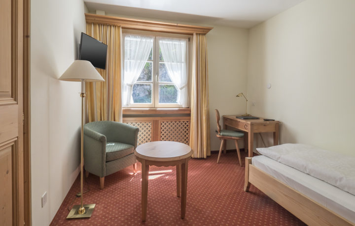Gemütliches Einzelzimmer im Engadiner Arvenholzstil gehalten mit Privatbad/Dusche, WC. Das Zimmer ist mit Flachbildschirm-TV mit integriertem Radio, etc. eingerichtet. Sämtliche Zimmer sind ruhig gelegen und 18-22 m2 gross und verfügen über ein französiches Bett. Ausgestattet mit allem, was man braucht; nicht mehr und nicht weniger.