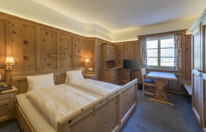 Gemütliches Arvenholz Doppelzimmer im Engadiner Stil gehalten mit Privatbad/Dusche, WC, Flachbildschirm-TV mit integriertem Radio, etc.. Sämtliche Zimmer sind ruhig gelegen und